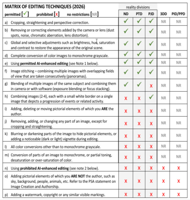 Artificial Intelligence Summary: Recognizing the rapid evolution of AI software, this rule is subject to change.  AI photo editing tools which enhance, adjust, or intelligently modify what was already captured in your photograph are permitted, provided they use only visual information already present in your photograph.  (For the latest PSA rules, consult the AI Statement on PSA’s website.)